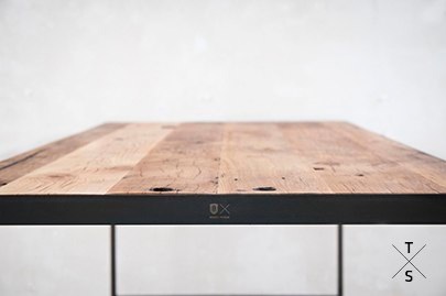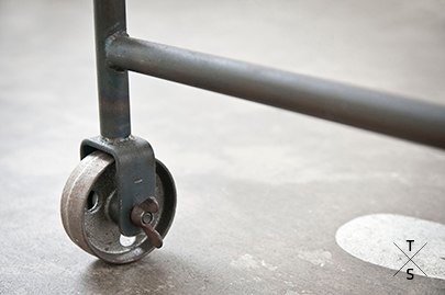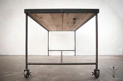 measurements 1800 x 800 mm. Table top: oak-wood from French goods carriage. Frame: steel frame with two cast iron wheels