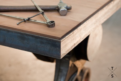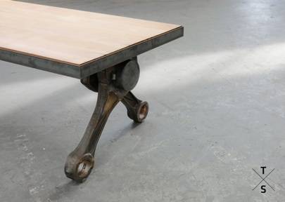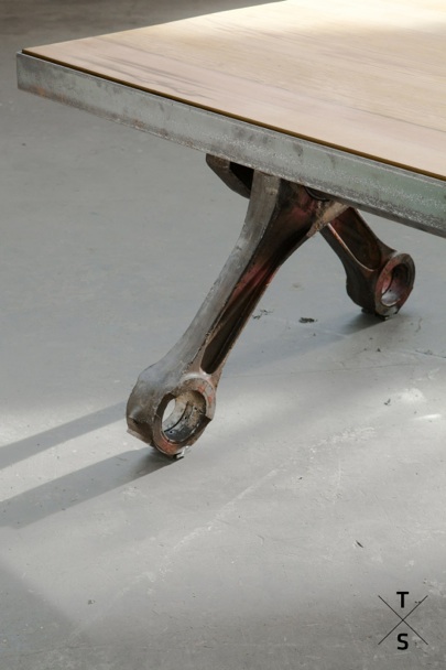 measurements 1060 x 2690 mm. Table top: wood from Kesbeke pickle barrels. Frame: piston rods from a Wärtsilä ship’s engine.